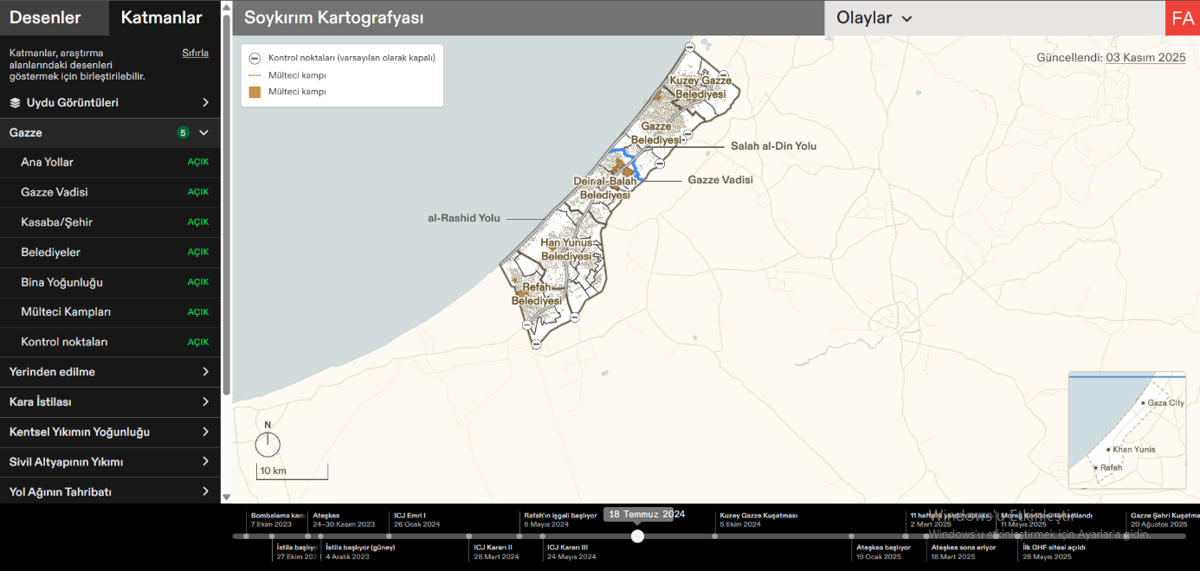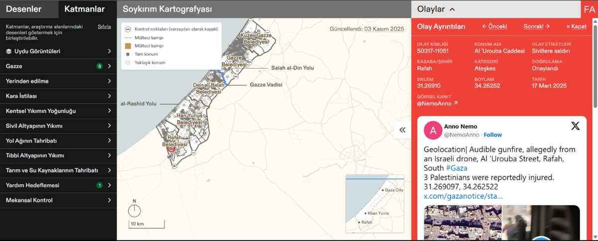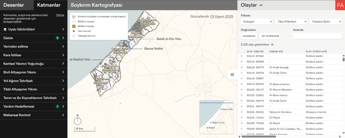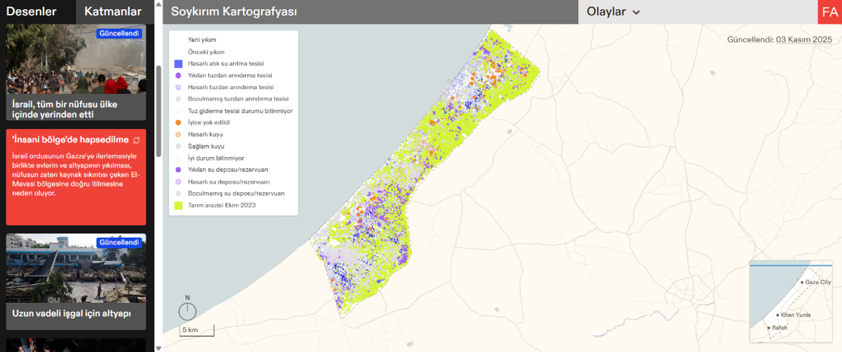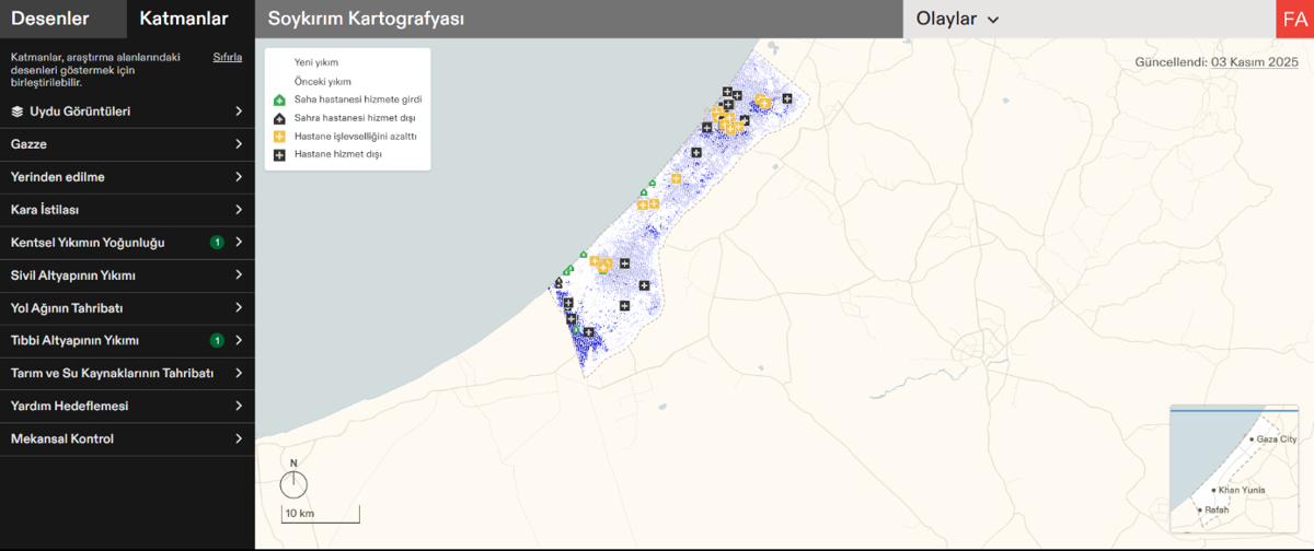 Savaşın seyrini harita üzerinde detaylı şekilde gösteren platform, süreç boyunca İsrail’in yaşattığı hak ihlallerinin dijital kaydını tutuyor.