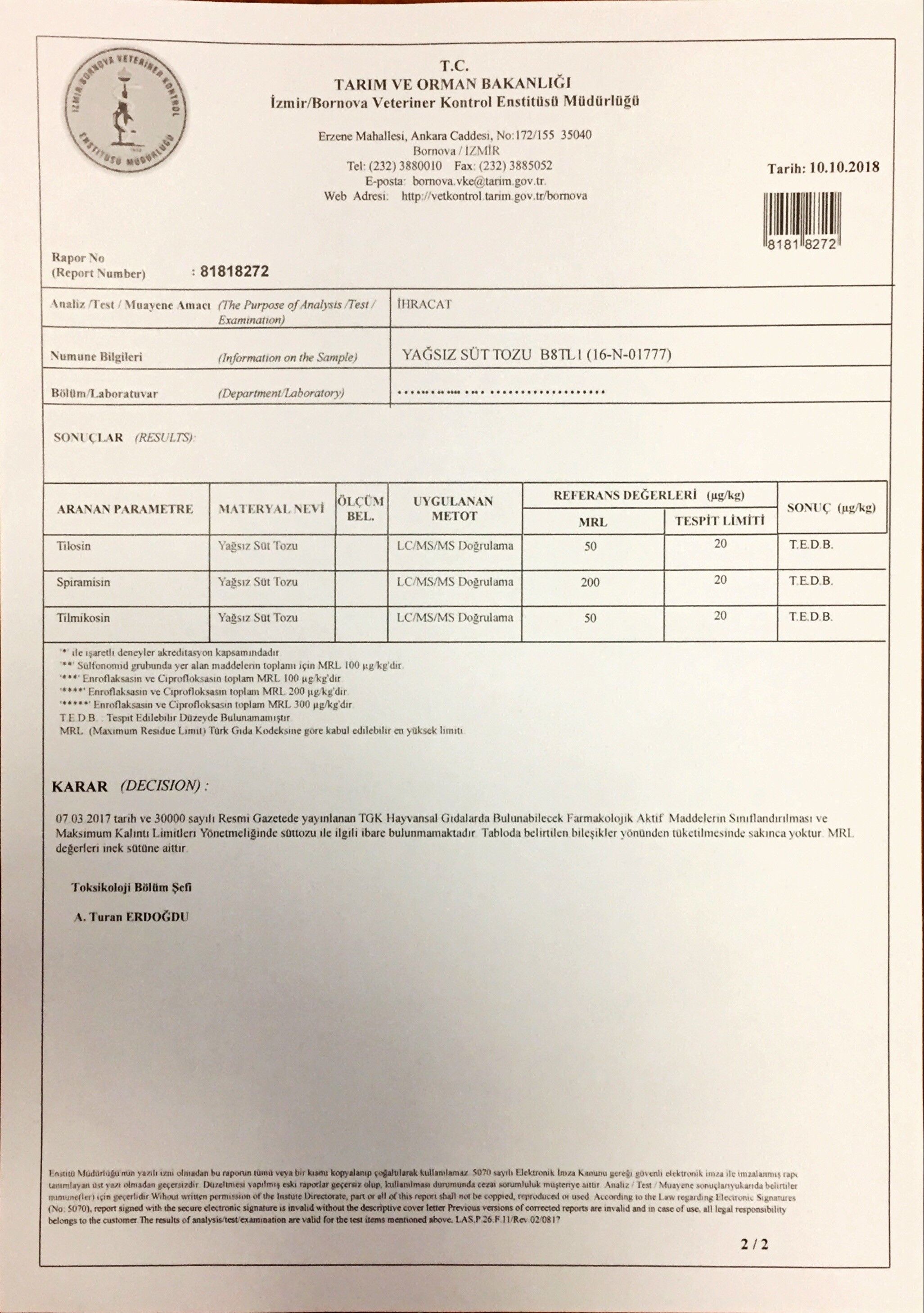 Enstitü tarafından düzenlenen analiz raporu aşağıda yer alıyor. Raporda Yer alan MRL ve Tespit Limiti ifadelerinin ne anlama geldiğini merak edenler şu yazılara bakabilir: Tıklayın Link1 ve Link2