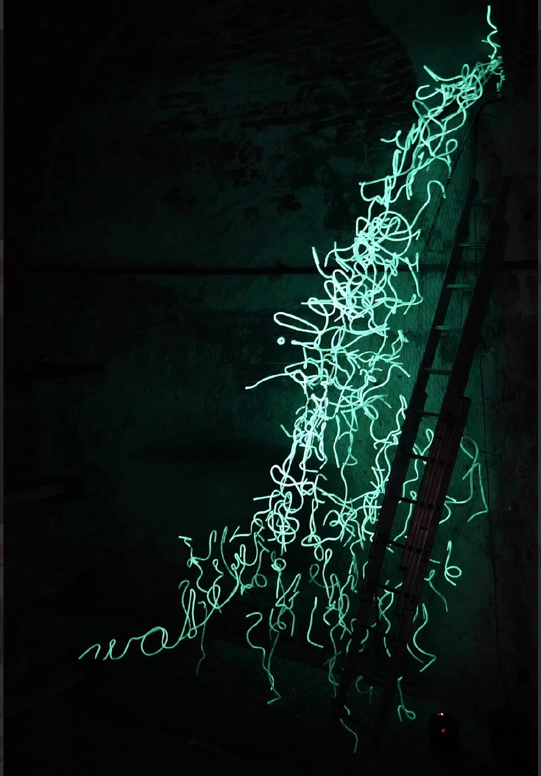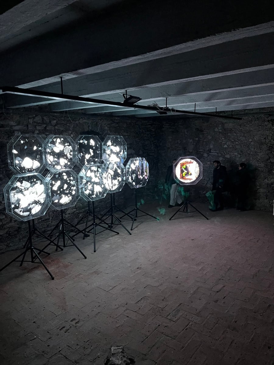 The curator, Ekmel Ertan, along with dramaturg Miran Bulut, beautifully stitched all six projects into a cohesive whole around this solid conceptualization. In this breathtaking historical venue, Buşra Tunç, with her work titled Ooze, creates letter-like forms and symbols that flow throughout the castle. They are intentionally not readable, randomly scattered, resembling the flow of water. Everything seems fluid, detached from its roots, and free from fixed historical references. Also, a voice installation accompanies the symbols like the whispers in the wind, adding an extra dimension to this powerful work.