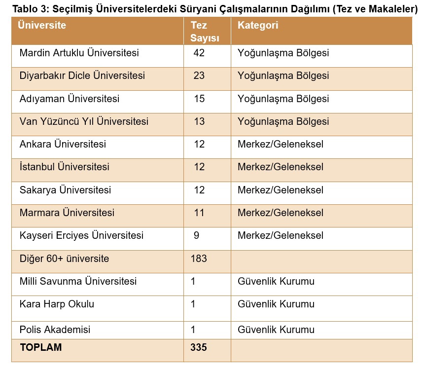 Tablo 3, Süryani çalışmaları alanındaki üretimin Türkiye üniversiteleri arasındaki dağılımını göstermektedir.