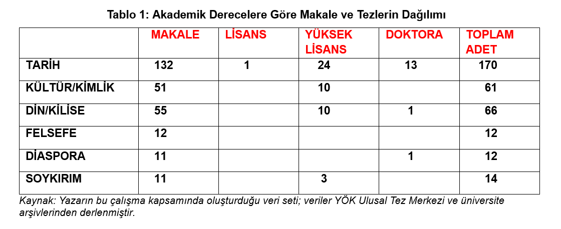 Veriler, incelenen 335 çalışmanın yarısından fazlasının “Tarih” (yüzde 50,7) alanında yoğunlaştığını; bunu “Din/Kilise” (yüzde 19,7) ve “Kültür/Kimlik” (yüzde 18,2) temalarının izlediğini göstermektedir. Yüzeyde bu çeşitlilik zengin bir tematik yelpaze izlenimi verse de, derinlemesine okuma bu dağılımın ideolojik seçiciliğini açığa çıkarır.