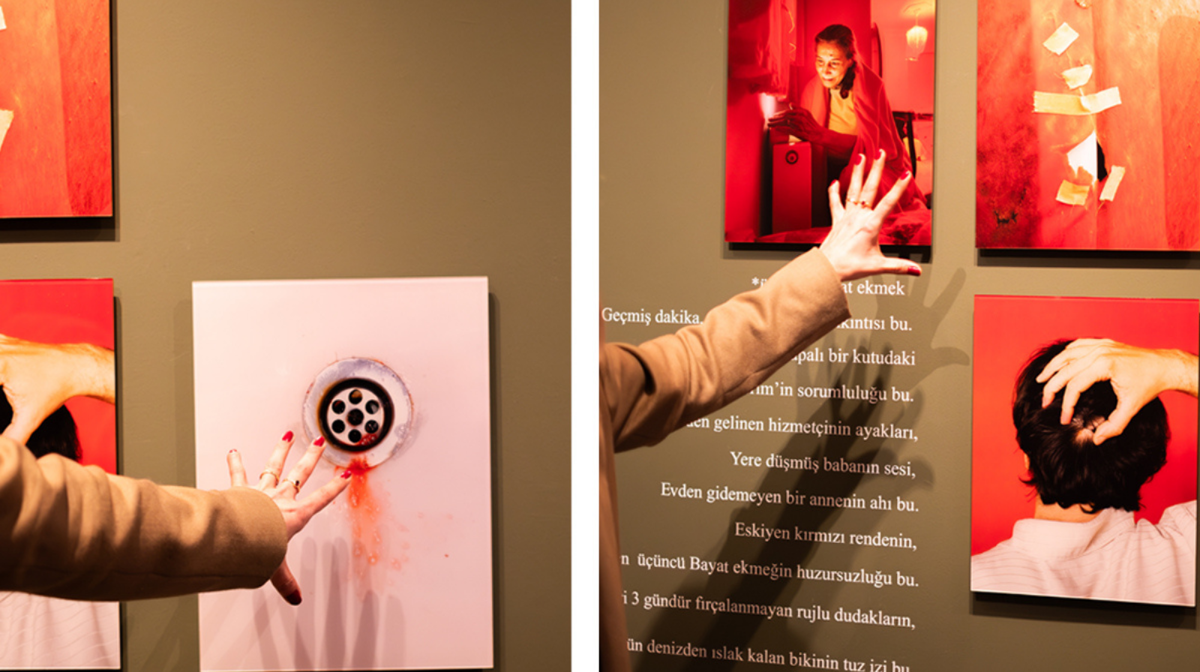 Bir köşede duruyorum uzun süre. Yeşil bir duvar. Dört fotoğraf ve her birinde ilk göze çarpan “kırmızı” rengi. Fotoğrafların altında, duvara yazılı bir şiir;